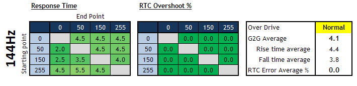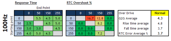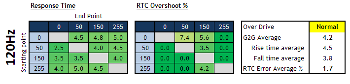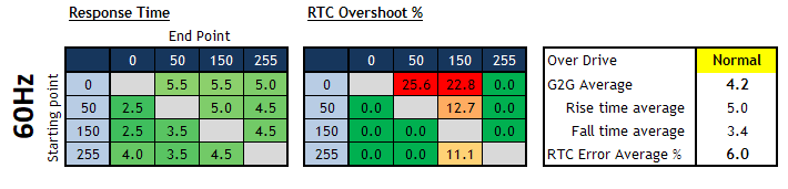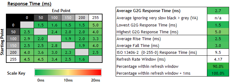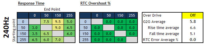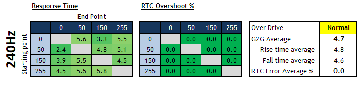 4.8ms G2G, no overshoot at 240Hz (Normal mode) 5.2ms G2G at 60Hz with no overshoot (Off mode) |