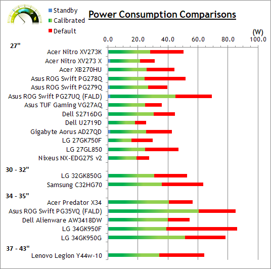 Read our detailed article about input lag and the various measurement techniques which are used to evaluate this aspect of a display. The screens tested are split into two measurements which are based on our overall display lag tests and half the average G2G response time, as measured by our oscilloscope. The response time element, part of the lag you can see, is split from the overall display lag and shown on the graph as the green bar. From there, the signal processing (red bar) can be provided as a good estimation of the lag you would feel from the display. We also classify each display as follows: