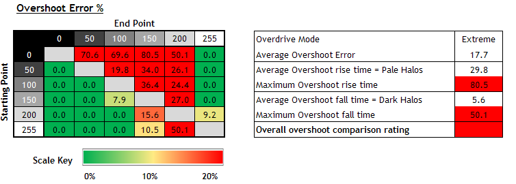 Response times are excellent overall with no noticeable overshoot when using the optimal response time settings. For 60Hz inputs and external devices you may want to switch to the 'Off' mode if you spot any issues with overshoot in the 'Normal' mode, although they are very minimal anyway. Even at 60Hz the response times are decent. |
