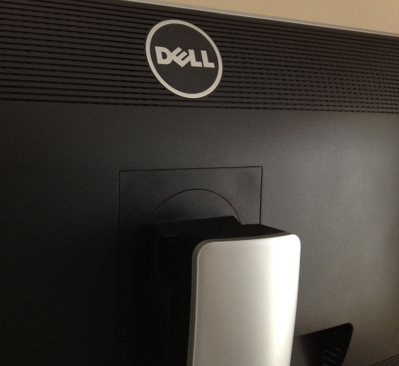 The back of the screen is again a matte black plastic and is nicely rounded and enclosed well. There is a round Dell logo at the top as shown above. The interface connections are located in the lower portion which you can see from the above image. While the front of the monitor arm / stand is a matte black colour, the back of the stand is a silver coloured plastic which looks nice and provides a good contrast to the black plastics elsewhere.