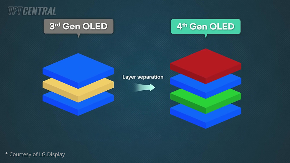 For Gen 4 they’ve separated that combined layer in to two distinct red and green layers which can omit their own light, giving 4 stacked layers in total. With the 2 existing blue layers now paired with the separate red and green layers, they’ve created that so-called ‘Primary RGB Tandem’ structure. It’s a marketing term of course, but that’s what they mean by that, and it’s a term you’ll see widely used when talking about their 4th Gen panels.