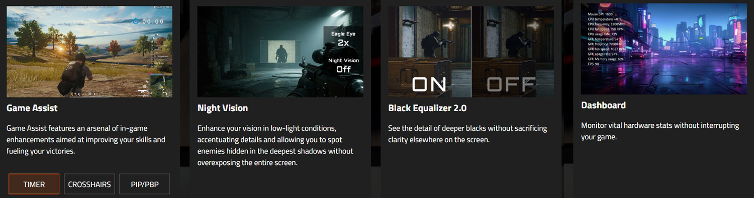 Gigabyte have also added loads of “AI Tactical” features and gaming functions to their new monitors, functions that can do things like auto-switch the picture mode and control things like crosshairs and black equalizer dynamically to enhance your gaming experience. These include: