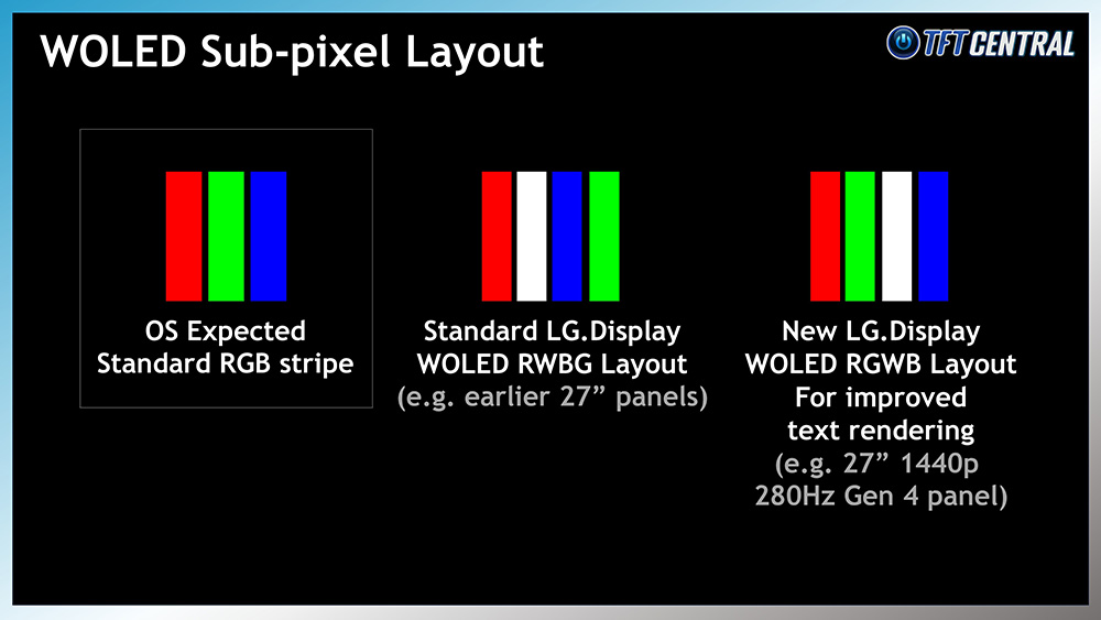 The new 4th Gen WOLED panels will however feature their improved sub-pixel layout, putting the red, green and blue back in their correct order and moving the white sub-pixel to be third in the order. This improved RGWB layout is superior to the old RWBG, where the white sub-pixel was in second place, and the red, green and blue were out of their usual order. This helps improve text clarity nicely, something we’ve tested in the past on other RGWB panels. LG.Display continue to explore true RGB sub-pixel structures for the future, and the latest information we have on those panels is covered in this video.