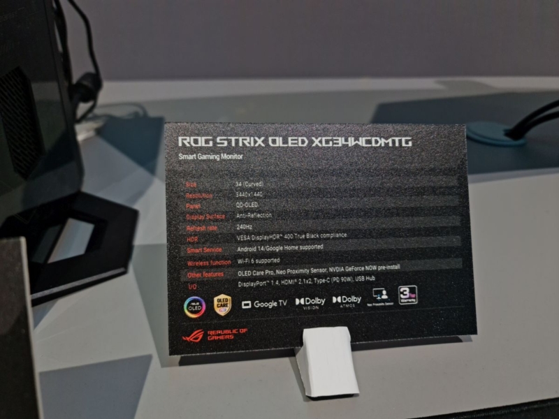 The Asus ROG Strix XG34WCDMTG is a 34″ ultrawide screen that we first saw unveiled at Computex in May. It’s a QD-OLED monitor (2nd Gen panel) with a 3440 x 1440 resolution and 240Hz refresh rate, a spec that we’ve seen a few times before. What makes this monitor different though is that it’s been combined with loads of Smart TV functionality, giving you a range of streaming apps and extras if you’re potentially looking for a hybrid monitor/TV for a bedroom or dorm room perhaps. Where you want an ultrawide for working or multi-tasking, or want to be able to use the range of PiP/PbP functions perhaps for handling multiple input sources at once.
