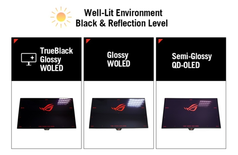 The ROG TrueBlack Glossy coating allows the monitors to display supersharp and clear images and presents deep blacks under any lighting, an improvement on previous WOLED glossy coatings from last year. Where this has been combined with the 4th Gen WOLED panel, this helps improve black depth even further.