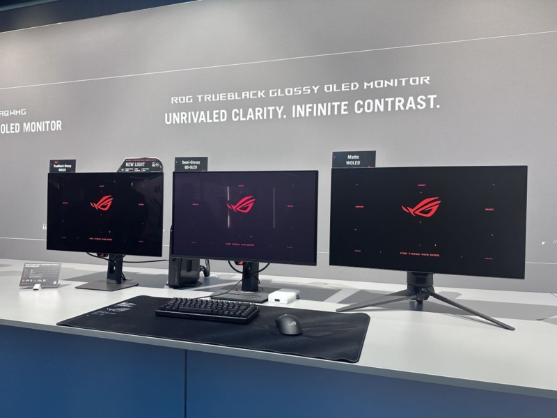 At the event Asus had this new screen (left) set up side by side with a semi-glossy QD-OLED screen (middle) and a matte anti-glare coated WOLED (right). You can see the impact that bright ambient lighting has on the QD-OLED panel especially, as well as on the matte panel which diffuses light sources more and causes blacks to get a little lighter than the glossy option, albeit that matte coating is better at handling reflections and glare than the glossy coating. It’s nice to have a range of options for different user preferences and use-cases. You can see these comparisons in more detail in our video from the event too.