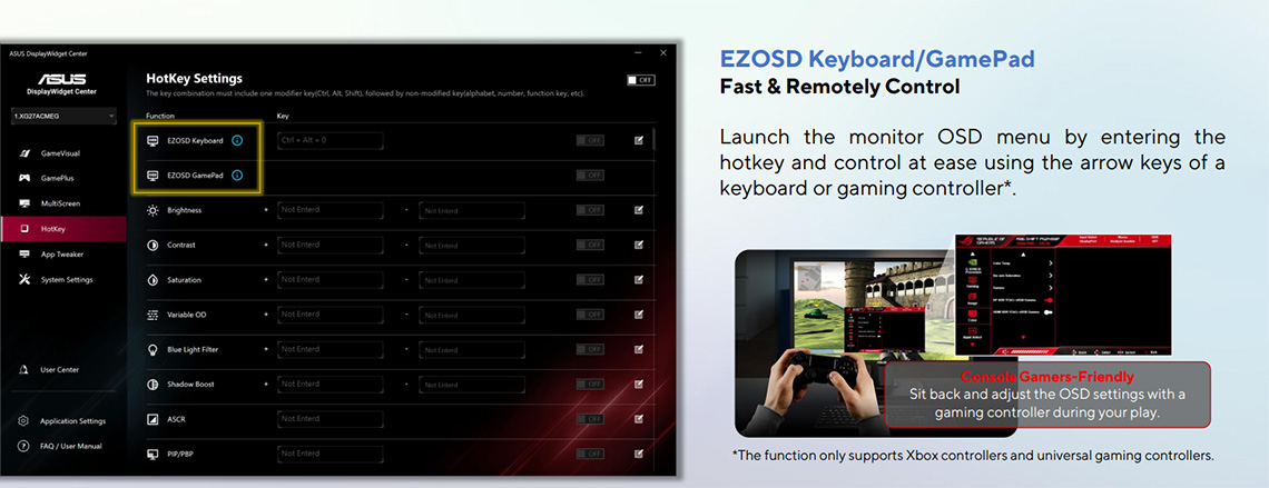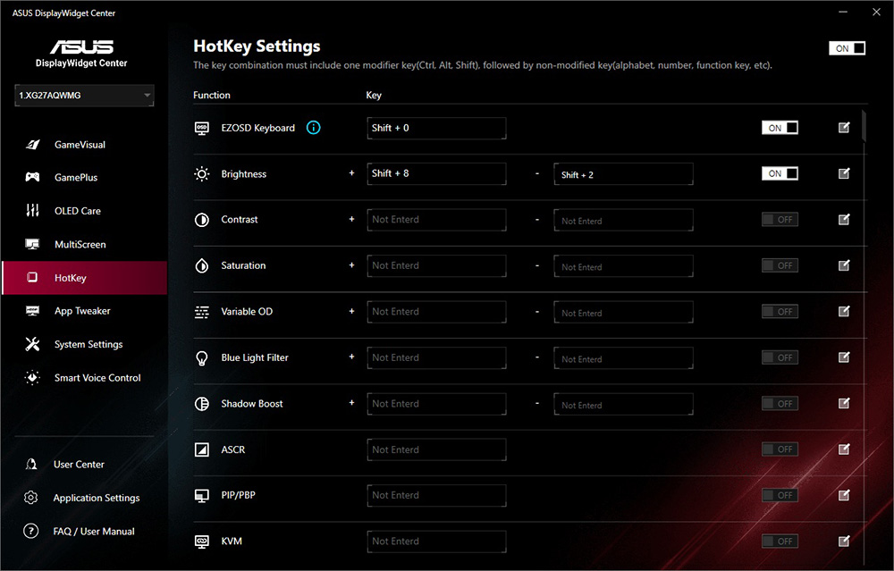 The HotKey menu allows you to control various screen settings using defined keyboard shortcuts. You can customize these how you want, and assign different functions to different short cuts. Really useful if you very quickly want to increase brightness during a game, or tweak settings like shadow boost perhaps.