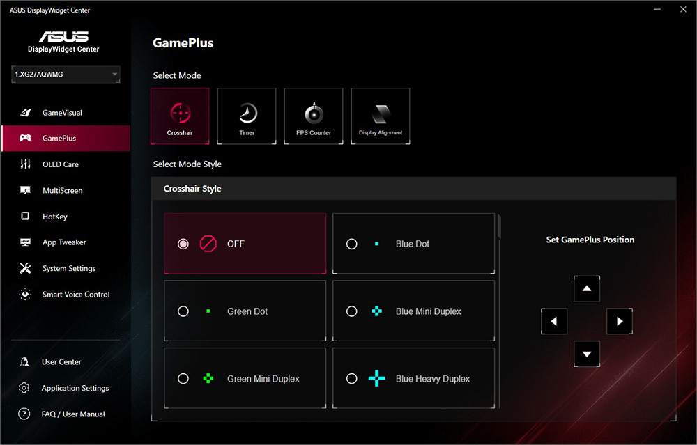 The ‘GamePlus’ section allows you to control additional gaming features like the Crosshair, Timer, FPS counter and Display Alignment where they are available on your screen. Useful if you want to enable these quickly during gaming, but then disable them afterwards.