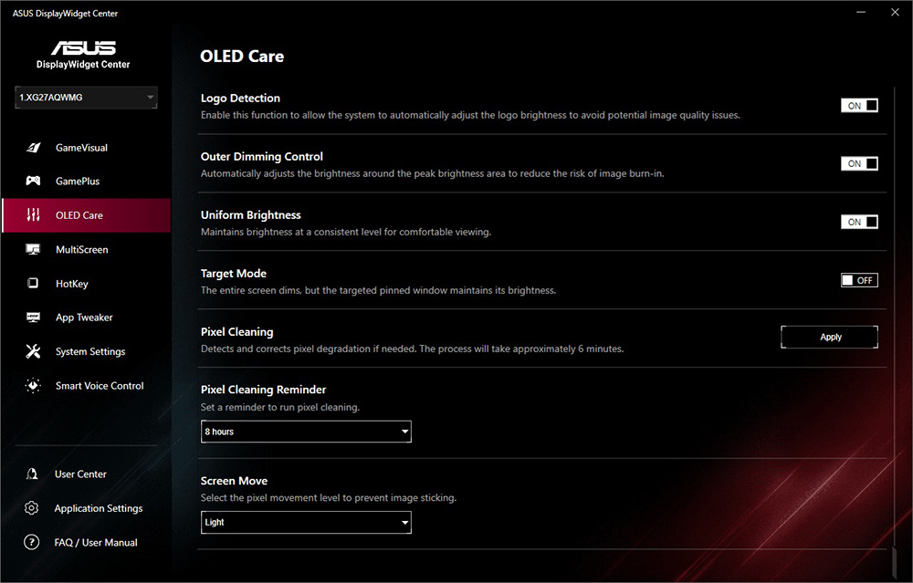 For OLED monitors there is an OLED Care section where you can turn the various features on and off. Of note here is an additional setting (on the tested XG27AQWMG at least) called ‘Target Mode’ which is not available via the main OSD menu. This dims your screen except for your open target window, so that can be useful for dimming background areas or parts of the screen that aren’t being used, to help reduce the risks of image retention.