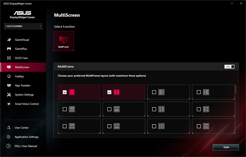 The MultiScreen or MultiFrame feature helps you manage multi-monitor setups and split screen working more easily. You can turn this function on and enable up to 3 possible layouts that you might want to use for tiling your windows on your desktop. When you then drag a window around, it will prompt you to align it to one of those grids. This is especially useful on larger and ultrawide screens.