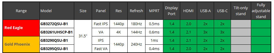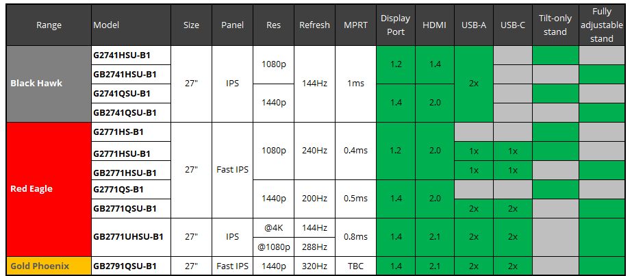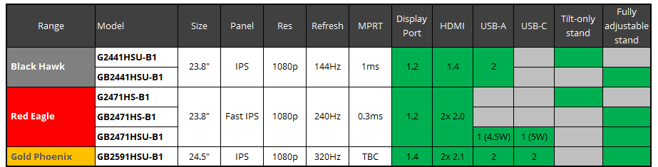 There’s also some new higher-spec models being released in their ‘Red Eagle’ line-up which offer a higher 240Hz refresh rate if you want something a bit faster, and they have a 0.3ms MPRT spec. These models have also undergone the more rigorous NVIDIA ‘G-sync Compatible’ certification process for reassurance around VRR performance. One new ‘Gold Phoenix’ model is also coming in the near future which offers an even faster 320Hz refresh rate and some extended connectivity options.