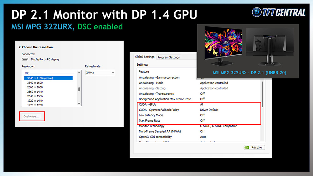 It does vary sometimes between different monitors, but most of the time what we’ve seen from our testing is that these features are not available when using DP 1.4 and DSC, and it’s a reasonable rule of thumb to use for ease here. As an example above is the MSI MPG 321URXW (the model with DP 1.4 only) where these features are not available.