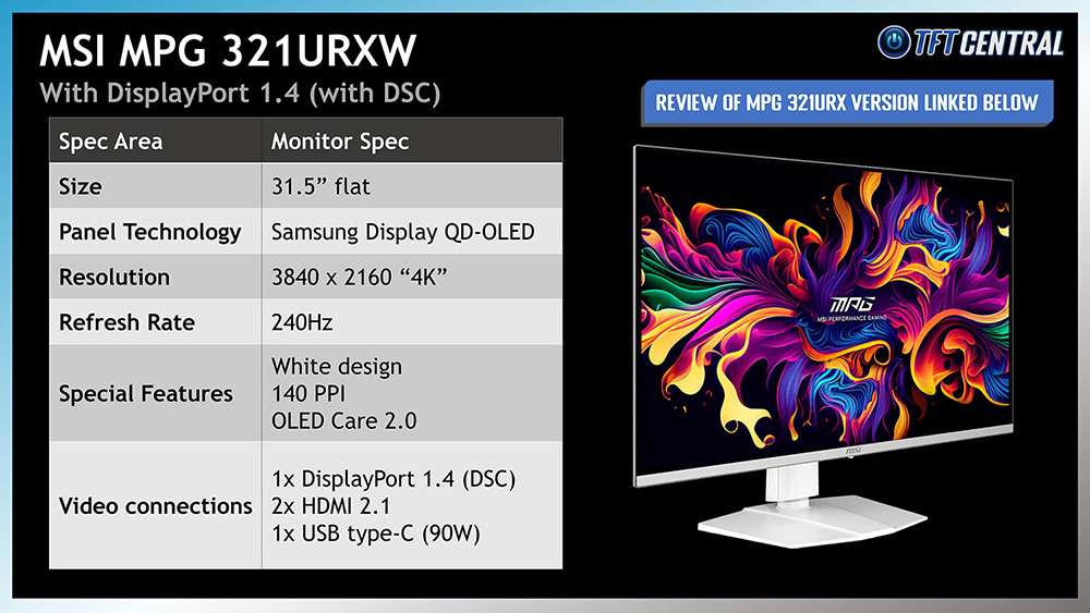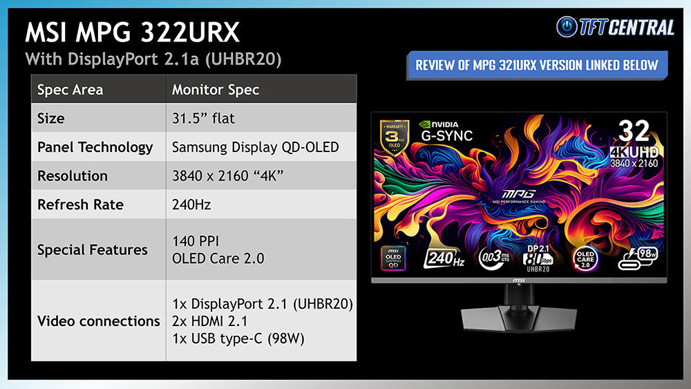 We’ve also got the recently released 32” 4K 240Hz MPG 322URX, which is an update to their very popular MPG 321URX monitor we reviewed last year, now just adding a full-speed UHBR20 DP 2.1 connection. The underlying panel and the rest of the spec remain the same, and it was already an excellent OLED monitor anyway, but if you’ve got an appropriate DP 2.1-capable graphics card and want a display that features this connection, this is another excellent option in the MSI OLED range.