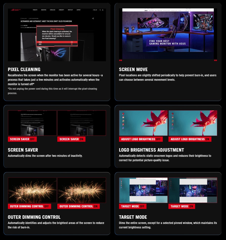 All these new ROG Strix affordable OLED monitors covered in this article include Asus’ latest range of OLED Care Pro features and settings to help mitigate the risk of image retention and burn-in. Some examples are shown here: