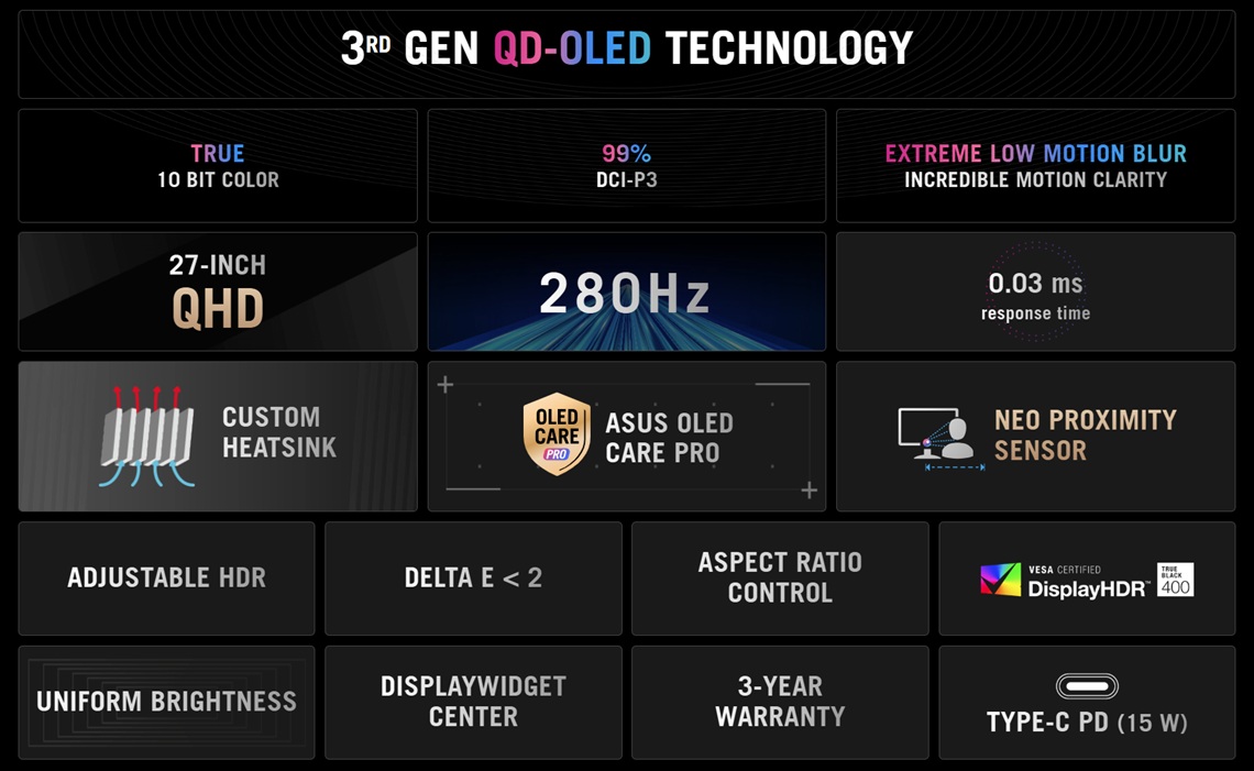 ![]() | ROG Strix OLED XG27AQWMG (review here) | 27″ screen size 2560 x 1440 resolution 4th Gen Tandem WOLED technology panel 280Hz refresh rate TrueBlack glossy coating 1500 nits peak brightness (HDR) 1x DP 1.4, 2x HDMI 2.1 and 2x USB-A data | ![]() |