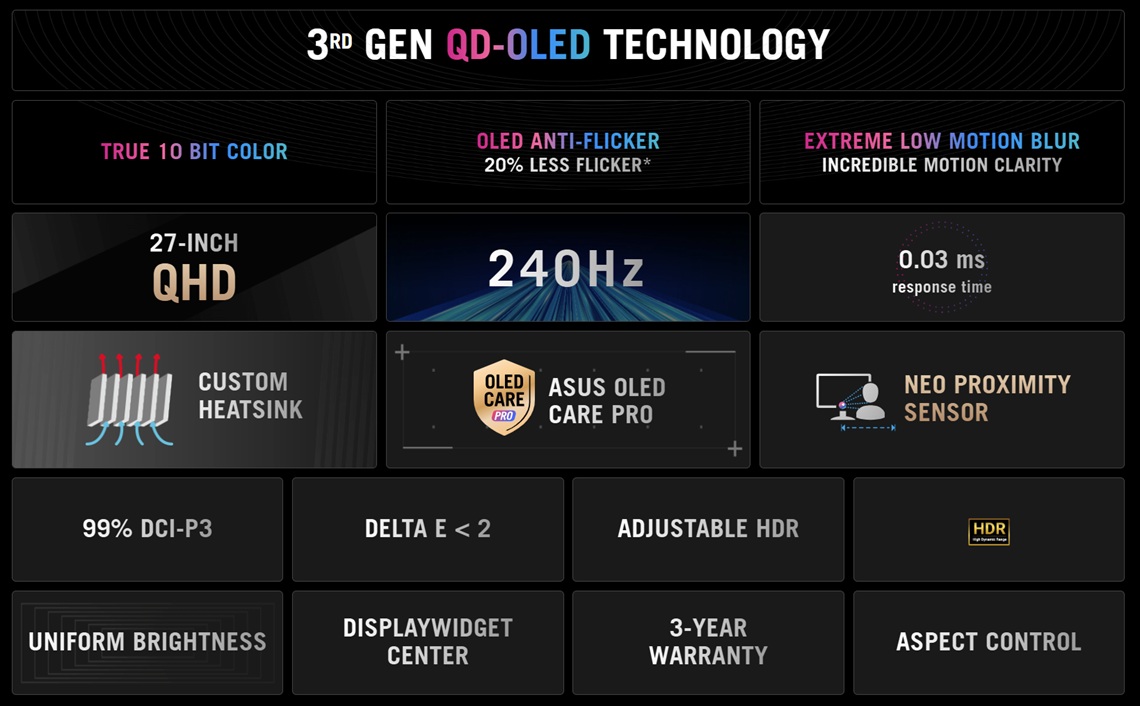 Although these new Asus monitors are lower priced, and part of their mid-tier ROG Strix line-up as opposed to their flagship ROG Swift line-up, you thankfully don’t have to sacrifice much when it comes to the feature-set. All their latest OLED technologies are included on these models which is great to see, including: