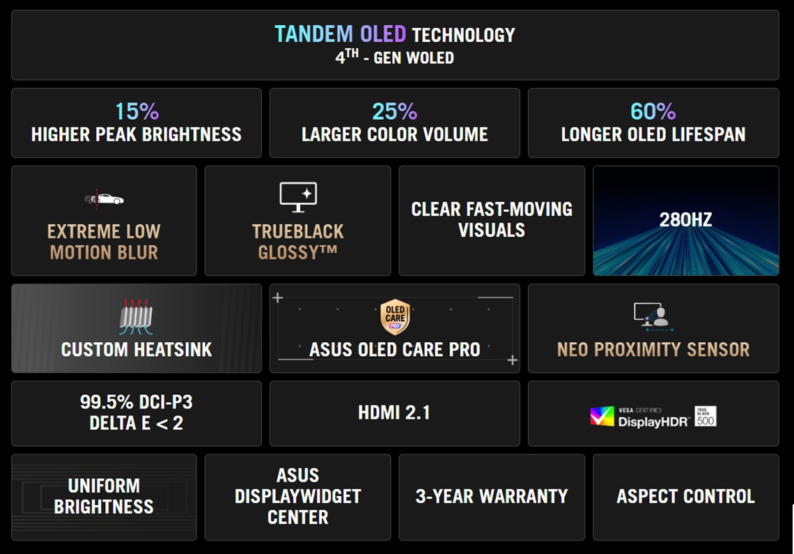 According to Asus this new panel technology provides “15% higher peak brightness, 25% larger colour volume, and 60% longer OLED lifespan versus previous-generation WOLED panels.” Not only this but they have combined this panel with their ‘TrueBlack’ glossy panel coating that we discussed earlier for exceptional picture quality.
