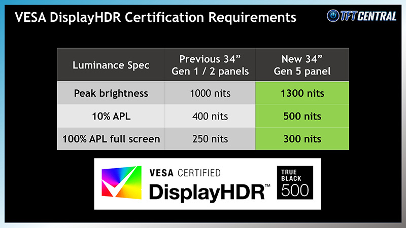 The new 5th Gen QD-OLED panel also offers enhanced brightness thanks to the use of their latest EL 3.0 OLED material (also featured on their 4th Gen panels), with a 300 nits SDR luminance and True Black 500 certification for HDR. It also includes for the first time an increased peak brightness spec of 1300 nits in HDR.