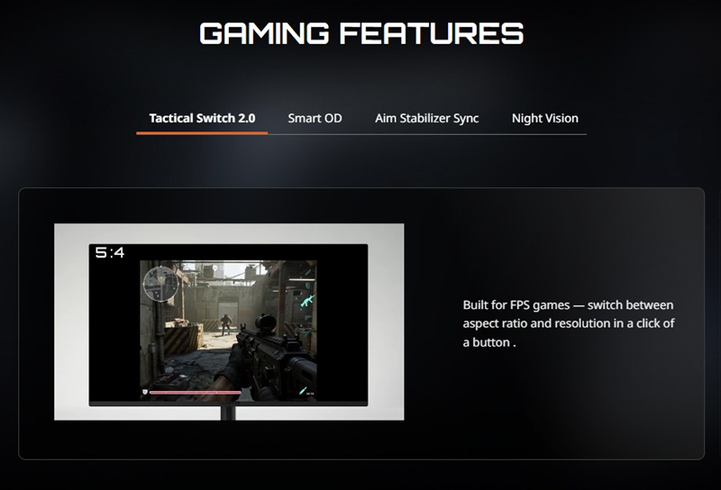 The 160Hz native refresh rate is supported by adaptive-sync technology for VRR from compatible systems and is certified under the NVIDIA ‘G-sync Compatible’ and AMD ‘FreeSync Premium’ schemes. Other gaming features include Smart OD, Aim Stabiliser Sync, Night Vision and Black Equaliser 2.0. It also has Tactical Switch 2.0 to allow you to switch between resolutions with one click of the button.