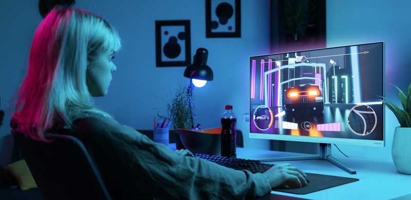 The Philips “AI enhanced” Ambiglow feature offers a unique and immersive viewing experience, using colour and light “to transport your gaming room into the action making it feel like you are part of the game.” This lighting can match what is being shown on the screen and is common on many of their TV models too.