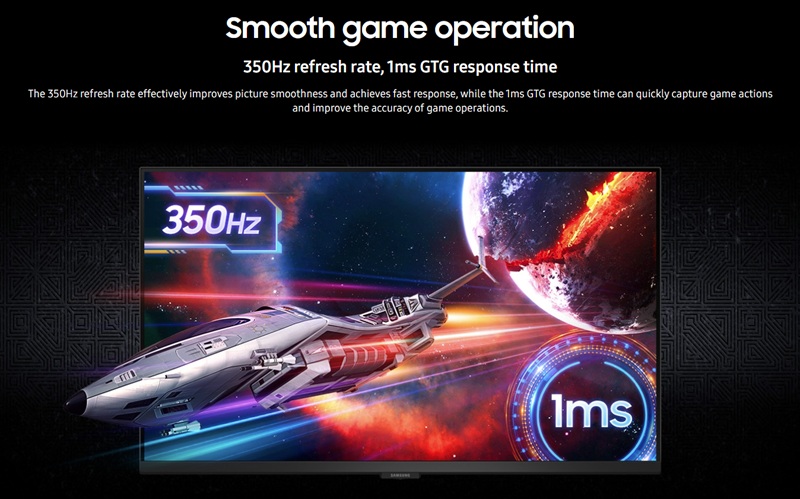 The high 350Hz refresh rate is supported by adaptive-sync for VRR from compatible systems (with a VRR window of 48 – 350Hz), with certification granted under NVIDIA ‘G-sync Compatible’ and AMD ‘FreeSync Premium’ schemes. Other gaming features include Black Equaliser, Virtual AIM Point, Super Arena Gaming UX and Auto Source Switch.