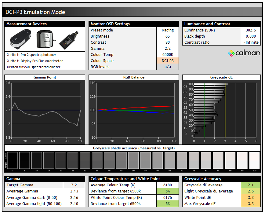 We’ve already analysed the EOTF tracking in detail in the previous section, but we can also look at the greyscale colour temp and white point here. You can see that there’s a small 1 – 3% deviance from the 6500K target, but that the greyscale temp and white point remain very close to their targets which is good news. This results in a nice accurate greyscale with dE 1.0 average measured. Shadow detail was weak with the first visible greyscale shade being RGB 6 in HDR tests.