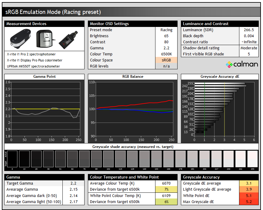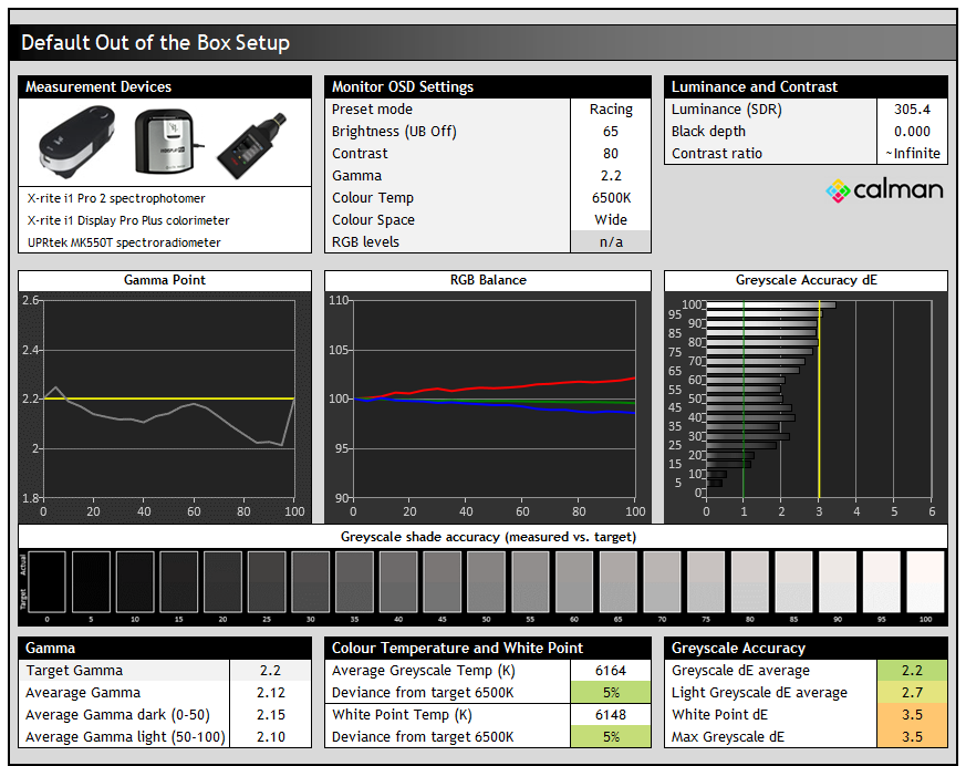 We measure the screen at default settings (with all ICC profiles deactivated and factory settings used). The results presented can be interpreted as follows: