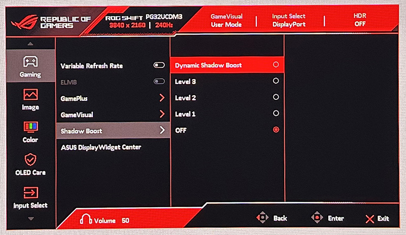 Most gamers will probably want to stick with the full gamut native custom mode for the most colourful image, and Asus provide a ‘Shadow Boost’ setting in the menu for tweaking things. This mostly impacts mid grey shades though, not improving the near-black detail that much. You get slight improvements if you move to Levels 1 – 3 (RGB 4 now visible). The ‘dynamic shadow boost’ mode brings out RGB 2 which is good, but raises the brightness of lighter grey shades a lot more so it’s fairly drastic. You can experiment with this setting a bit in your gaming to see if it helps bring out some of the detail in dark games. In HDR you don’t have access to the black stabilizer settings, although shadow detail was already good (RGB 3).