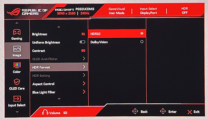 There was excellent console support from this screen. 4K 120Hz works fine along with support for features like VRR and 4K 24Hz content (for stutter-free movie playback). You can use the ELMB function at 120Hz which is potentially useful for boosting motion clarity in gaming to 240Hz-like levels, which we will discuss ed in the previous section. This model can support both HDR10 and Dolby Vision HDR formats, you just need to switch to the relevant mode in the OSD menu to make DV available if you want to enable that and have a compatible console.