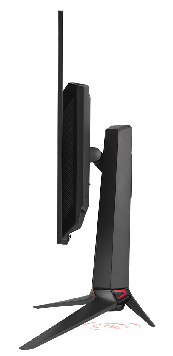 The back of the screen is encased in a matte black plastic with a familiar design. There’s an ROG logo lighting feature on the back, as well as a logo projector from the bottom of the stand. Both can also be disabled from the OSD menu if needed.