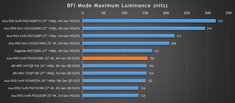 On this screen the luminance can be adjusted up to 156 nits which is very typical for a QD-OLED panel and on par with other modern monitors we’ve tested which use this technology. We’ve seen some recent 4th Gen WOLED monitors reach a lot higher though, so it does feel like QD-OLED is lagging behind in BFI brightness at the moment.