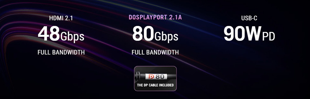 - 1x DisplayPort 2.1a (UHBR20), 2x HDMI 2.1, 1x USB type-C (90W power delivery)