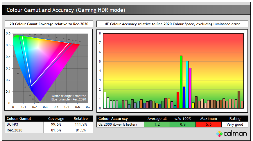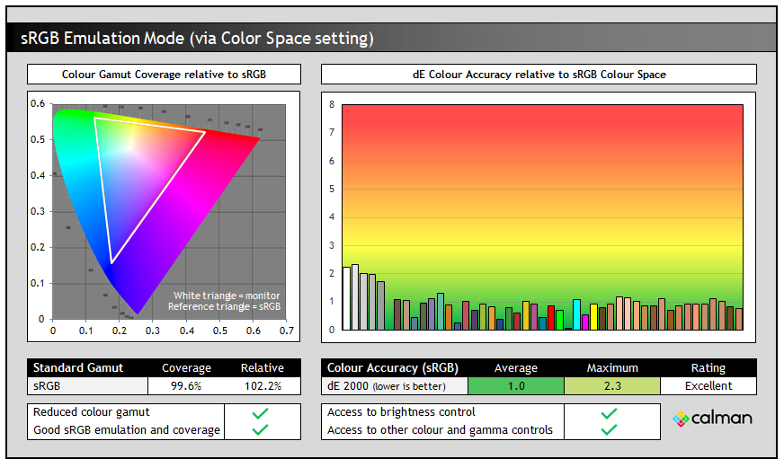 The FPS mode improves shadow detail but is configured to 2.0 gamma and has very saturated and vivid colours, so not everyone would want to entertain using that configuration. The sRGB Cal mode improves things a lot (RGB 1) thanks to the sRGB gamma curve used, but that’s clamped to the smaller sRGB colour space all the time and is pretty inflexible in settings. It might be useable though for SDR gaming if you’re happy with the smaller colour space.