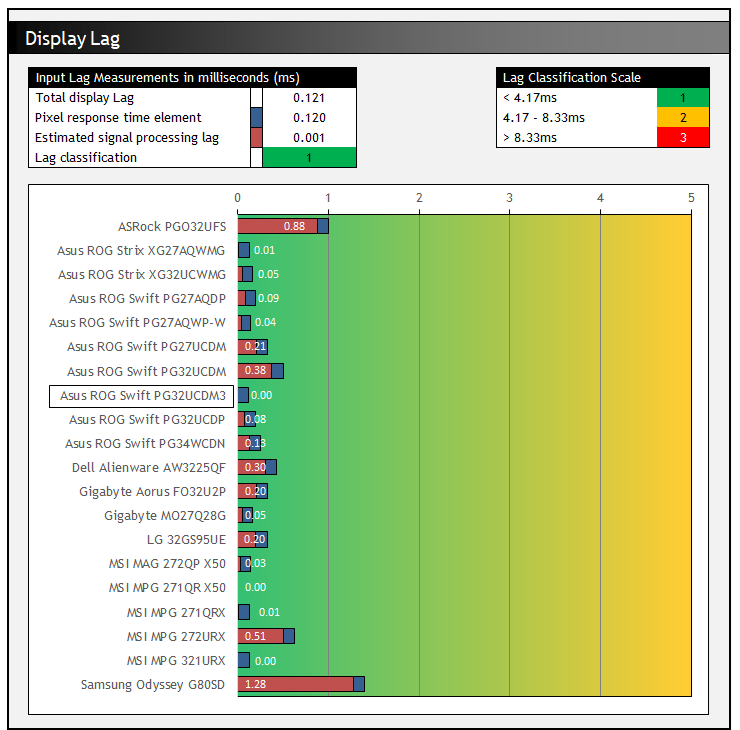 Read our detailed article about input lag and the various measurement techniques which are used to evaluate this aspect of a display. The screens tested are split into two measurements which are based on our overall display lag tests and half the average G2G response time, as measured by our oscilloscope. The response time element, part of the lag you can see, is split from the overall display lag and shown on the graph as the green bar. From there, the signal processing (red bar) can be provided as a good estimation of the lag you would feel from the display. We also classify each display as follows: