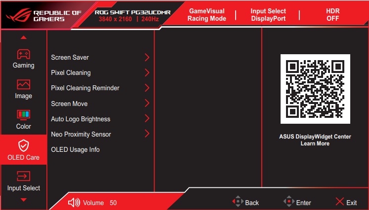 To help mitigate the risks of image retention Asus provide an impressive and expanded set of OLED care options within the OSD menu under their ‘ROG OLED Care Pro‘ features. Familiar options include the pixel shift / screen move which moves the image slightly a few pixels at a time periodically (you can turn this off fully if you want). There’s also a screen saver which dims the screen if there is no change to the image for an extended period of time. There’s also an image cleaning cycle which will run automatically from time to time, or you can run manually in the menu if you want.