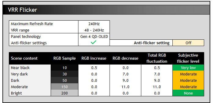 We tested the screen in normal ‘off’ mode and found there was moderate levels of visible flicker in dark and moderate scenes. Unlike WOLED panels, the gamma is not directly tied to the frame rate and so flickering behaves a bit differently. You get consistent spikes of flicker in terms of their amplitude, but the frequency of those spikes increases as your frame rate lowers.