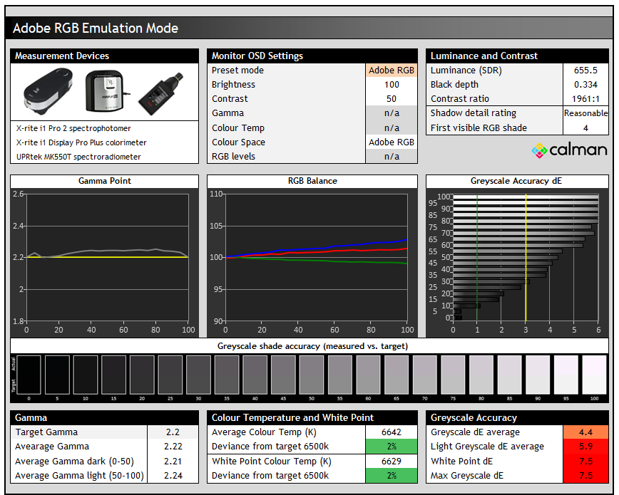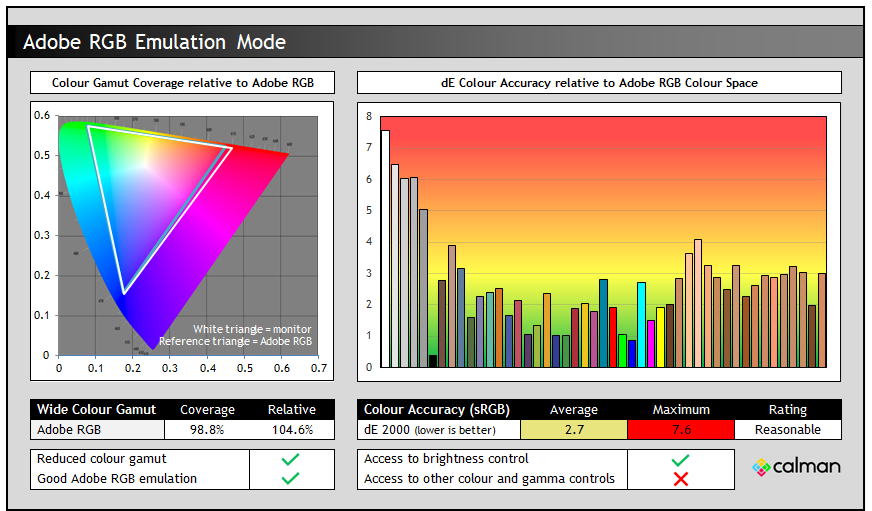There’s also a couple of Adobe RGB emulation modes available. The main mode is configured to 2.2 gamma and D65 white point, while a separate D50 mode is configured to that warmer colour temp if you need.