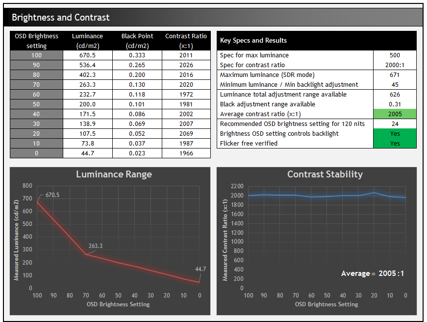 The brightness adjustment range from the backlight was very wide, with a maximum luminance of 671 nits measured, considerably beyond the specified 500 nits in fact. At the bottom end of the brightness control adjustment the screen could reach a nice low luminance of 45 nits which should be fine for users wanting to use the screen in darkened room conditions and low ambient lighting. Contrast was stable across the adjustment range, measured at 2005:1 average which was very good for an IPS-type LCD panel, and in line with the 2000:1 spec nicely. Backlight dimming is flicker free without the need for PWM which is great news.