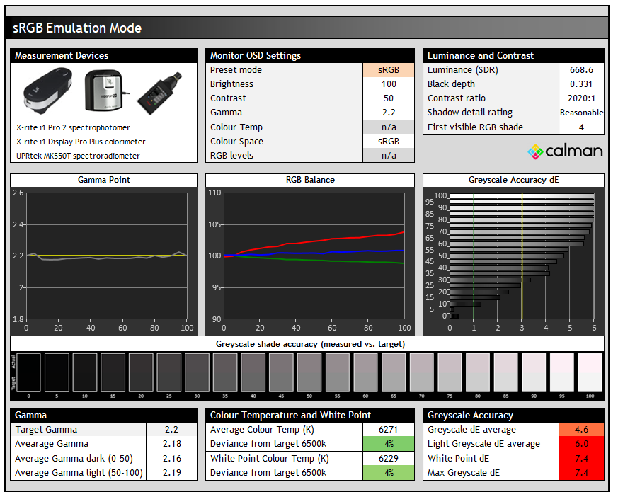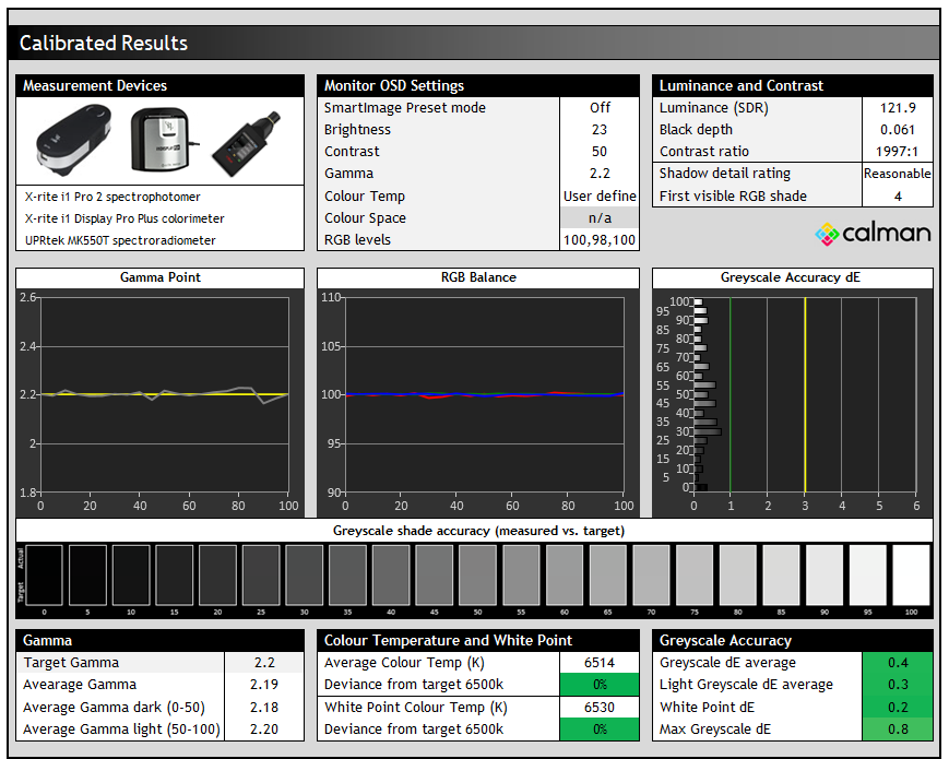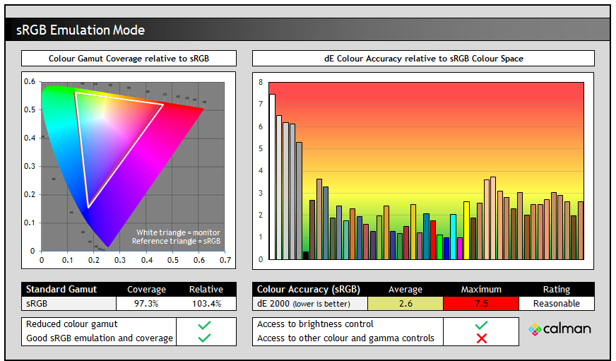 In this section the screen was profiled to 2.2 gamma, 6500K colour temp and to the sRGB colour space. The screen was left in its native wide gamut mode, but this profile will be used in colour-aware applications to map back to sRGB in this instance. Overall the calibrated results were very good as you’d hope.
