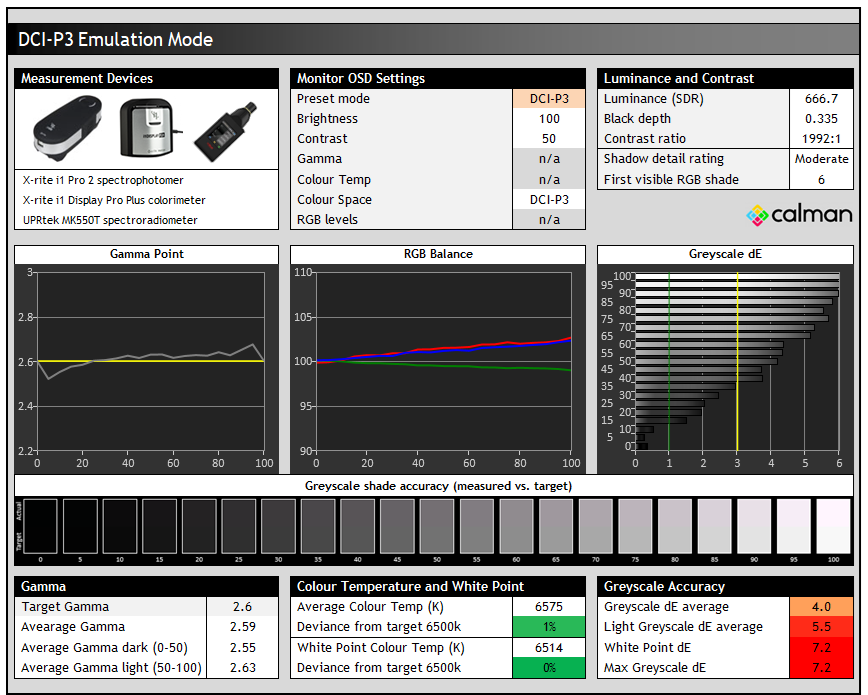 The main difference between the two modes is with the gamma, with the Display P3 mode following 2.2 gamma very closely and the DCI-P3 mode following 2.6 gamma instead. With the higher gamma in the DCI-P3 mode, shadow detail is not quite as good so keep that in mind but then this configuration is designed for specific use cases and for those wanting to work with a 2.6 gamma. The DCI-P3 mode also has a higher default brightness setting of 100%, whereas the Display P3 mode is on 70% by default.