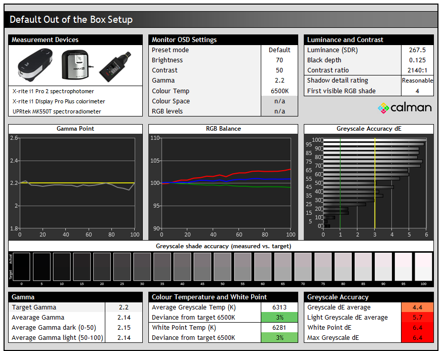Gamma tracking was very good overall and we measured a 2.14 average with a strong performance across the greyscale which was only a little lower than the target of 2.2. The colour balance on the middle graph showed a weighting towards red and blue channels which resulted in a slight pinkish tint to grey shades, demonstrated by the actual vs. target sample patches shown in the middle section. That impacted greyscale accuracy unfortunately with a poor dE 4.4 average measured. Shadow detail was reasonable with the first greyscale shade visible being RGB 4, somewhat restricted here by the IPS LCD panel and the limited contrast ratio and black depth inherent to this panel technology.