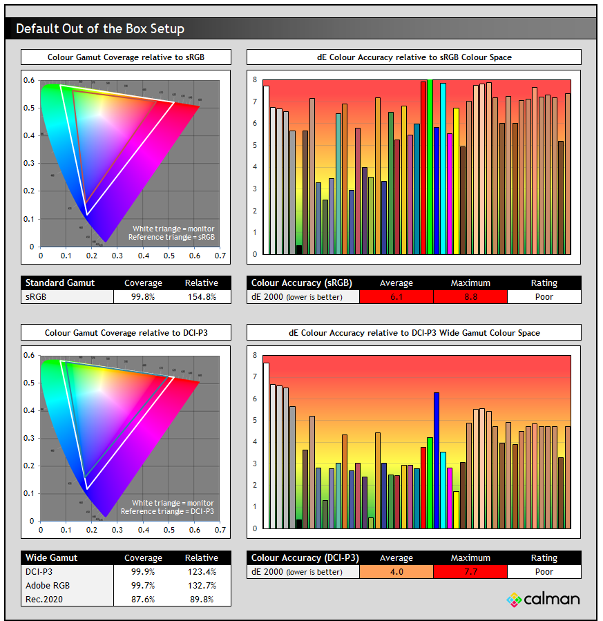 In the bottom section you can see that the native colour space covers DCI-P3 and Adobe RGB very well at ~100% absolute coverage, but again extends a considerable way beyond those spaces by about 23 – 33%. DCI-P3 colours were still rated as “poor” with dE 4.0 average because of this over-coverage and because of the pretty poor greyscale accuracy we’d seen before.