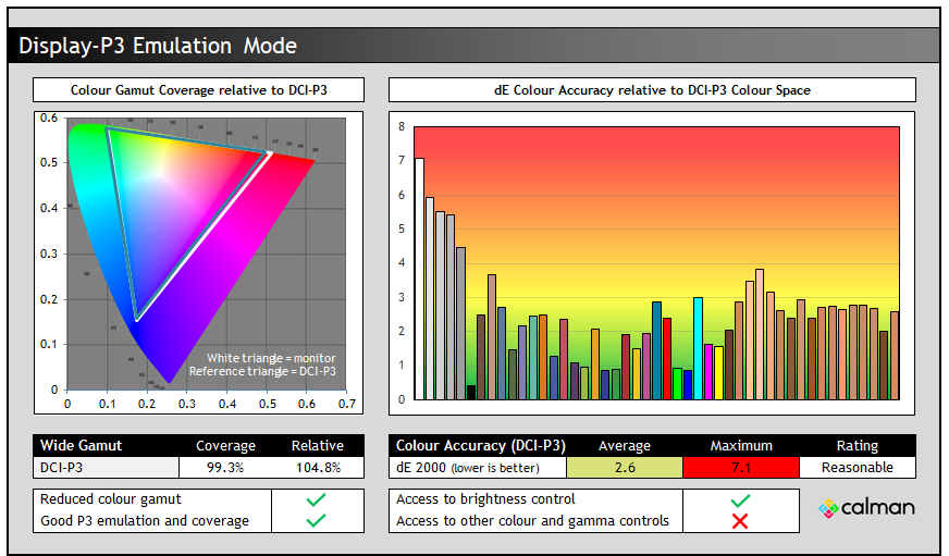 There’s no real difference at all when it comes to colour space clamping or colour accuracy in these two modes, with both offering a good clamping back close to the DCI-P3 colour space which is great. That’s a colour space commonly used in HDR content creation and consumption. Like the sRGB emulation mode there was access to the brightness control but no other colour or gamma settings.
