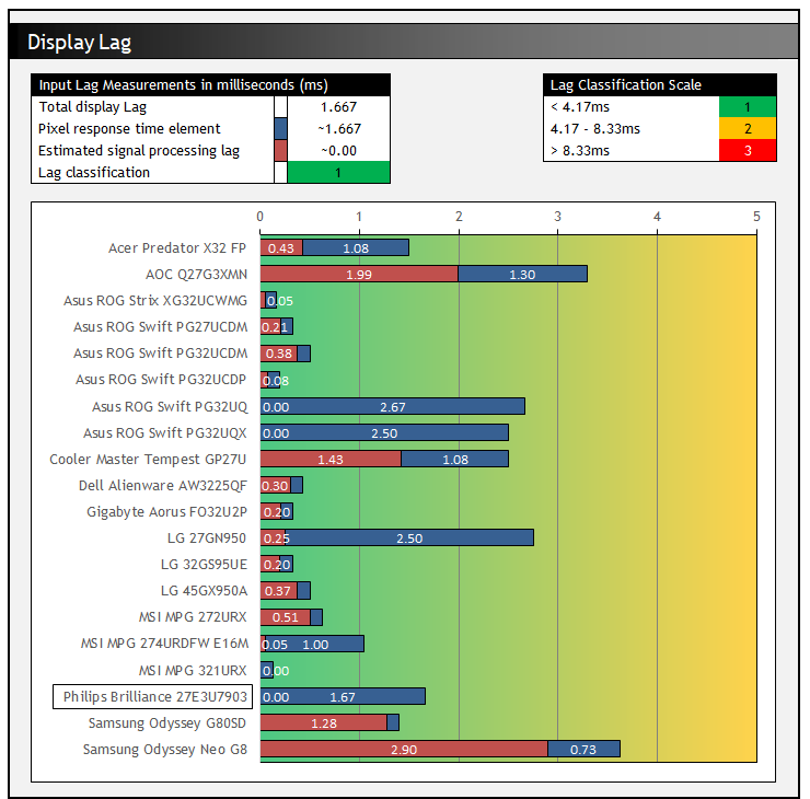 Read our detailed article about input lag and the various measurement techniques which are used to evaluate this aspect of a display. The screens tested are split into two measurements which are based on our overall display lag tests and half the average G2G response time, as measured by our oscilloscope. The response time element, part of the lag you can see, is split from the overall display lag and shown on the graph as the green bar. From there, the signal processing (red bar) can be provided as a good estimation of the lag you would feel from the display. We also classify each display as follows:
