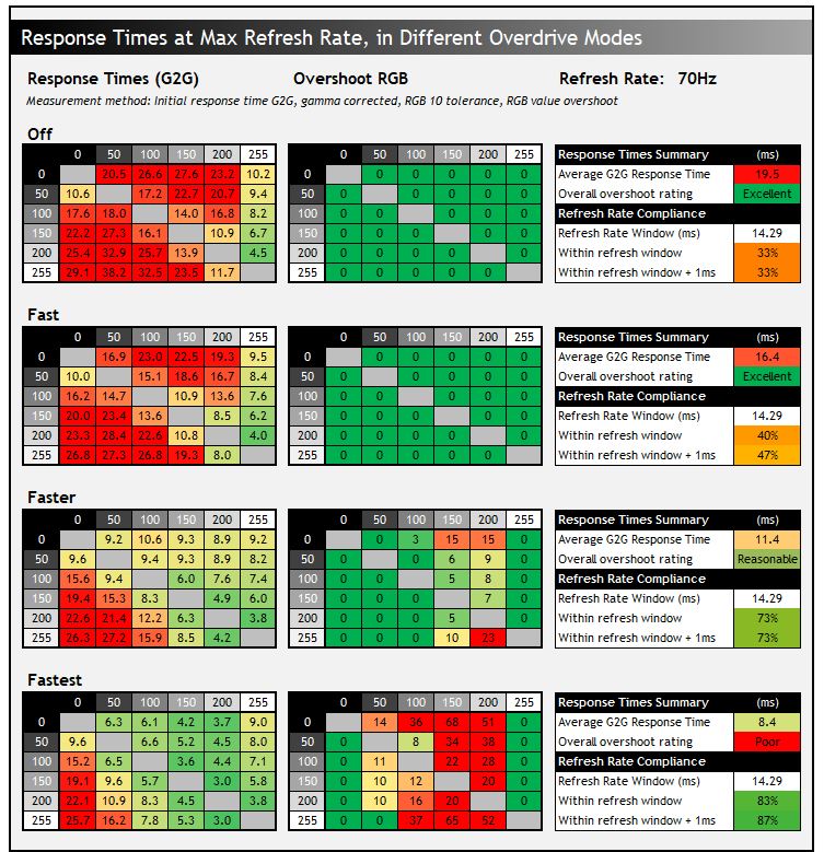 We measured the response times times in each of the 4 overdrive modes and also tested the screen in a range of visual tests to determine the optimal mode. In the ‘off’ mode the pixel transitions were horribly slow, measured at 19.5ms G2G average. There was no overshoot at all, but the response times aren’t even fast enough to keep up reliably with the low 70Hz refresh rate, and so you get a smeary and blurry image on moving content. They weren’t really much different or better in the ‘fast’ mode either.