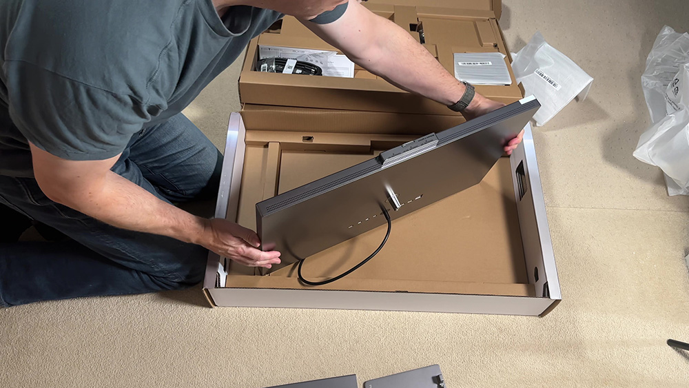 One thing we should note that we’ve never seen on any monitor we’ve tested is that there is a power cord permanently connected to the back of the screen that you can see in some of our unboxing photos above. This has a kettle lead female socket on the end, so you just plug a normal kettle power lead in to it, rather than plugging it in to the monitor directly. The power supply is built in to the screen so there’s no need for any external power brick, and ultimately it makes no real difference, it’s just unusual.
