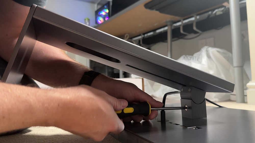 The stand is finished in the same dark silver matte plastic with a simple but nice-looking design. There’s a cable tidy hole in the back of the stand as you can see from the photos above, and a thin and small dark silver metal foot which has to be screwed on to the stand as well when you unbox it. Sometimes the angles of the cables are tricky to thread through the cable tidy hole due to their perpendicular connection in to the back of the screen, especially if you then want to alter the stand positioning and angle.