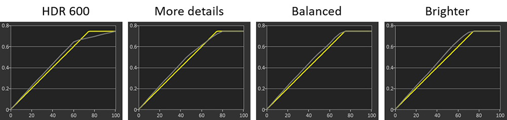 We’d found the EOTF tracking in the default DisplayHDR 600 mode to be quite poor, leading to a lot of over-darkening of light grey shades and impacting real-world HDR scene brightness. The ‘personal’ HDR mode opens up various options to configure ‘tone mapping’ if you want to tweak the EOTF tracking further. There is a mode in there for ‘HDR 600’ which performs exactly the same as the standard DisplayHDR 600 preset mode measured above. There are also options for ‘more details’, ‘balanced’ and ‘brighter’. We tested the EOTF tracking in each of these modes: