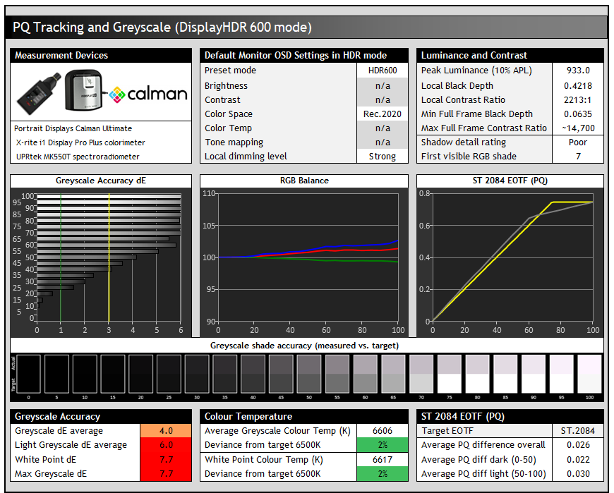 The colour temp remains a little weighted towards blue and red like in the SDR mode, resulting in a pinkish tint to grey shades and weakening the greyscale accuracy. Shadow detail was also pretty poor in this mode (and the other HDR configurations in fact) with the first visible shade being RGB 7 in HDR. We’d have liked some better near-black shadow detail in HDR.