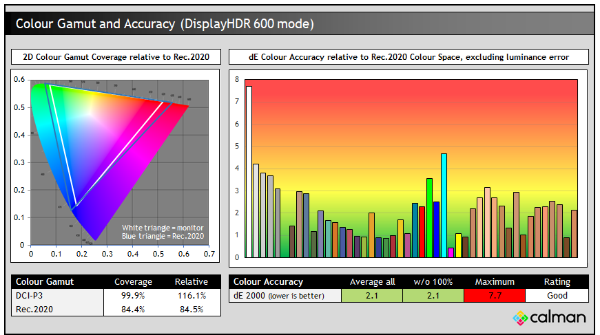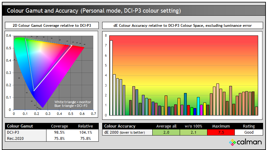 You can see that in this mode that most of the over-coverage compared with DCI-P3 is removed, reducing from 116% relative coverage to 104% now. That more closely matches the DCI-P3 reference space now and we had good accuracy (dE 2.0 average) for DCI-P3 colours too. This mode could be useful to some HDR content creators potentially.